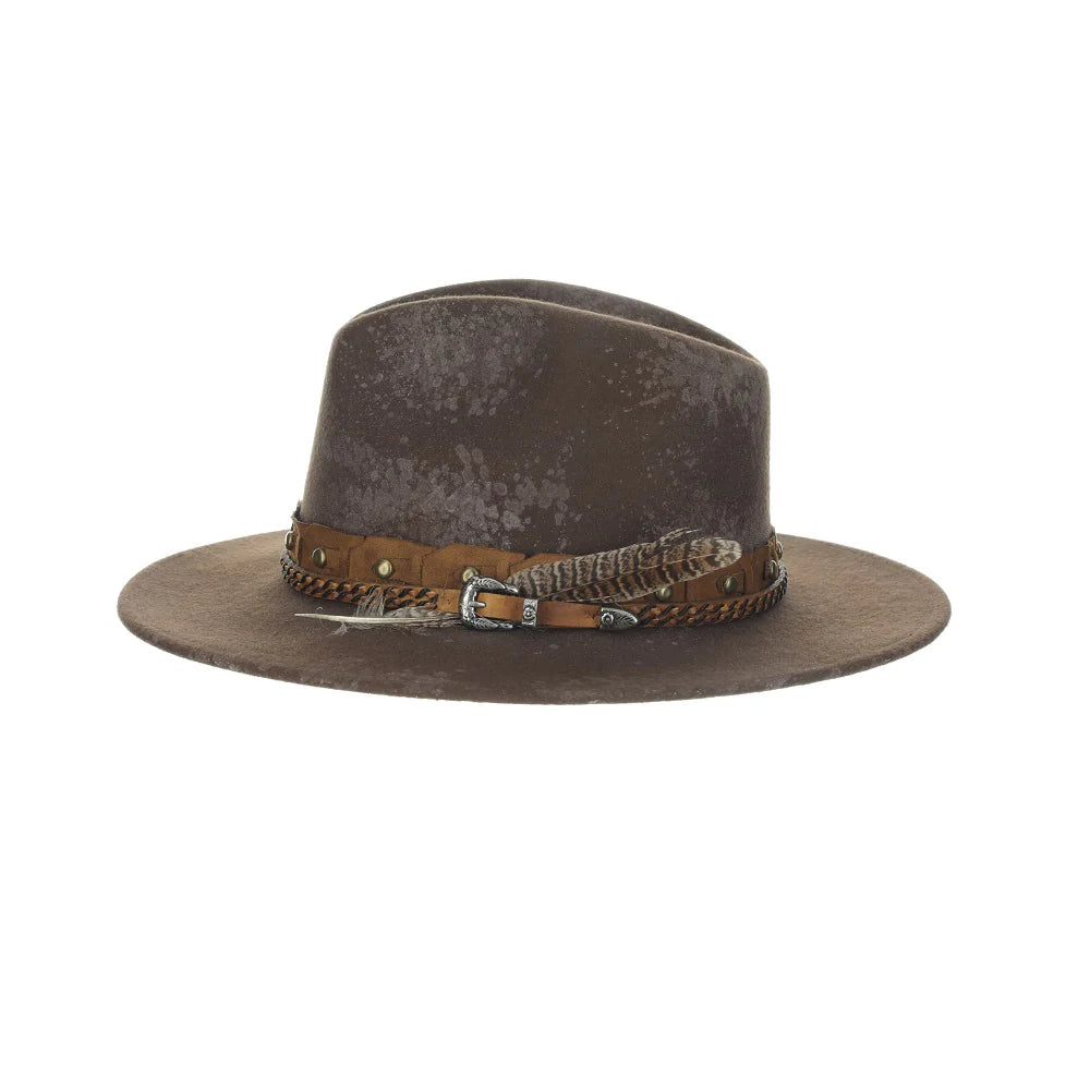 This hat was made for the trend-setter. The person who isn't afraid to take a risk. To put it all out there. If that sounds like you, we dare you to try this hat. Designed with splattered wool fabric and multi-layered suede band with braids, a buckle and feather, there is nothing like this hat on the market.