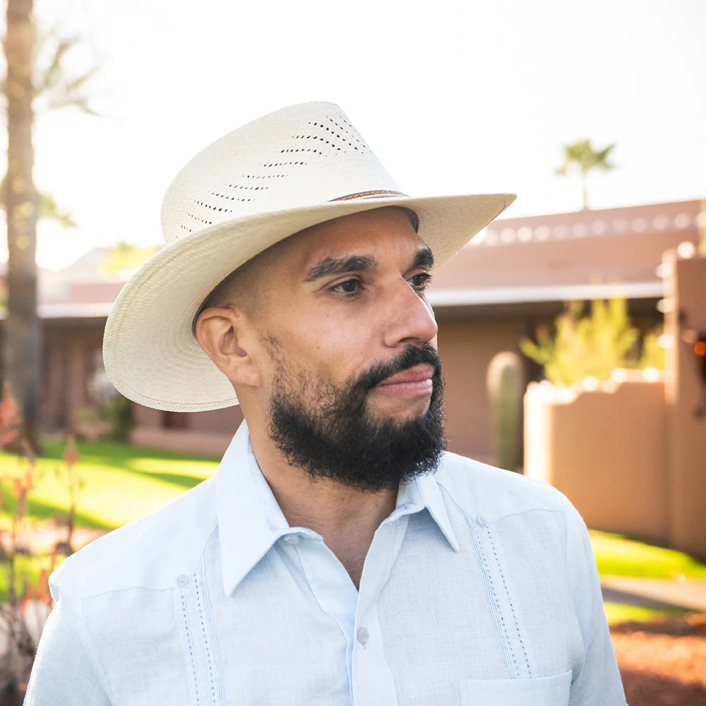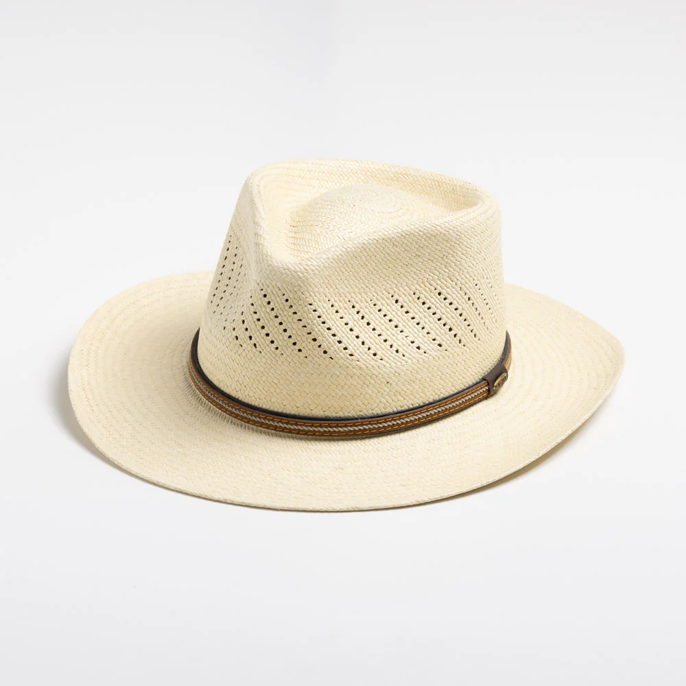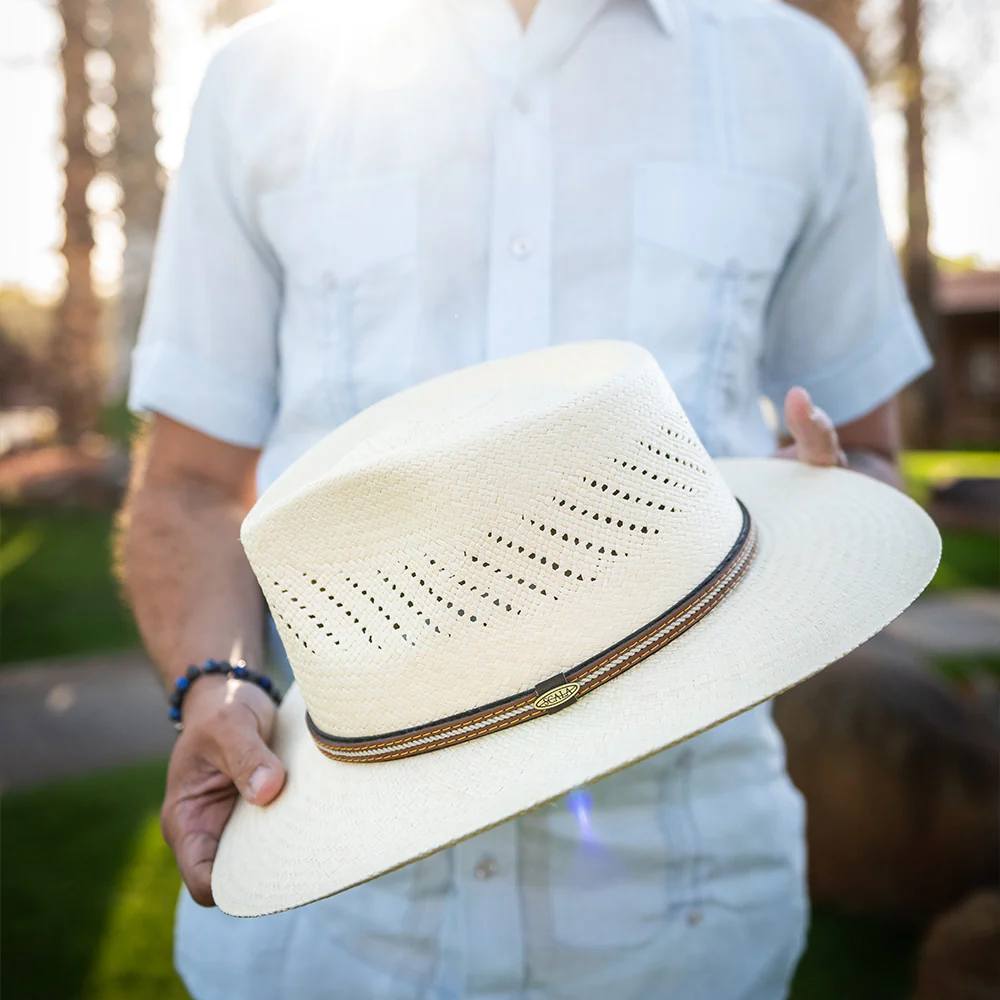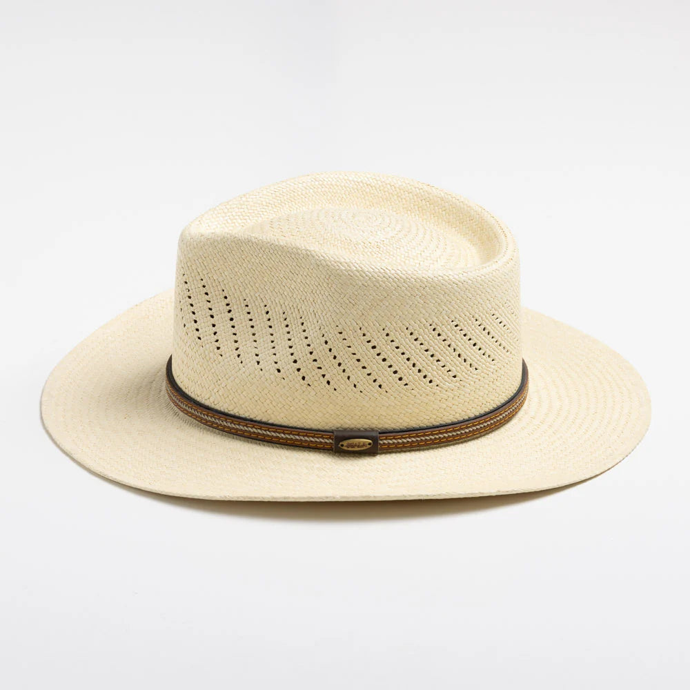 There's no better way to showcase quality than a hand-woven Panama straw hat. This wide-brim outback hat with a vented crown is no different. Ideal for almost any event, it will make you look great while keeping you cool.