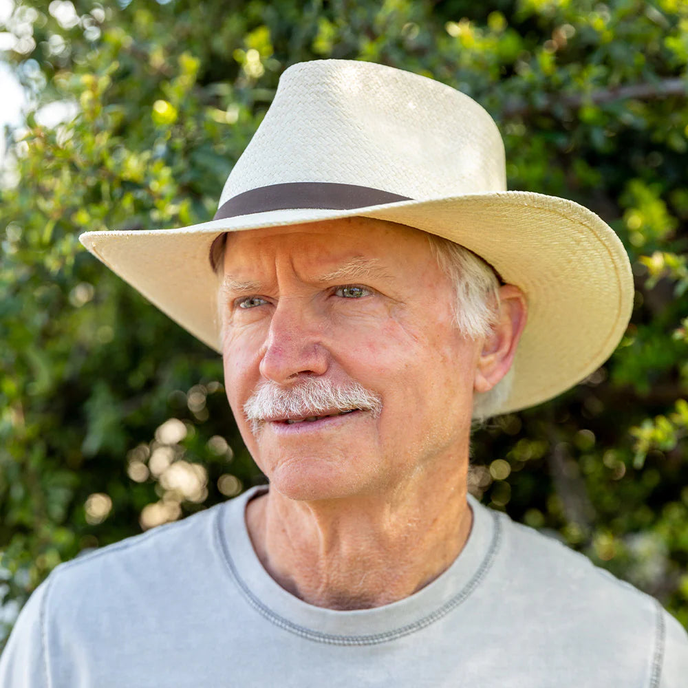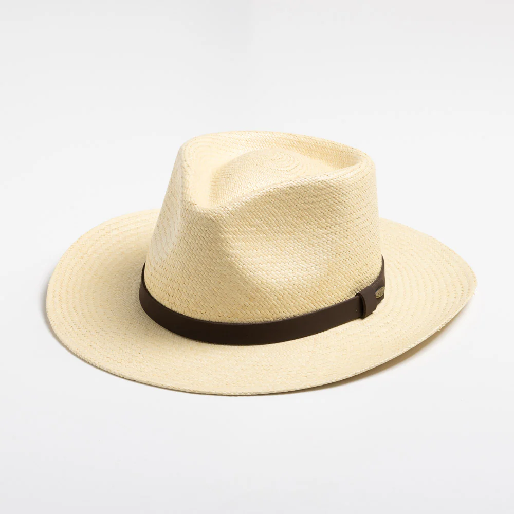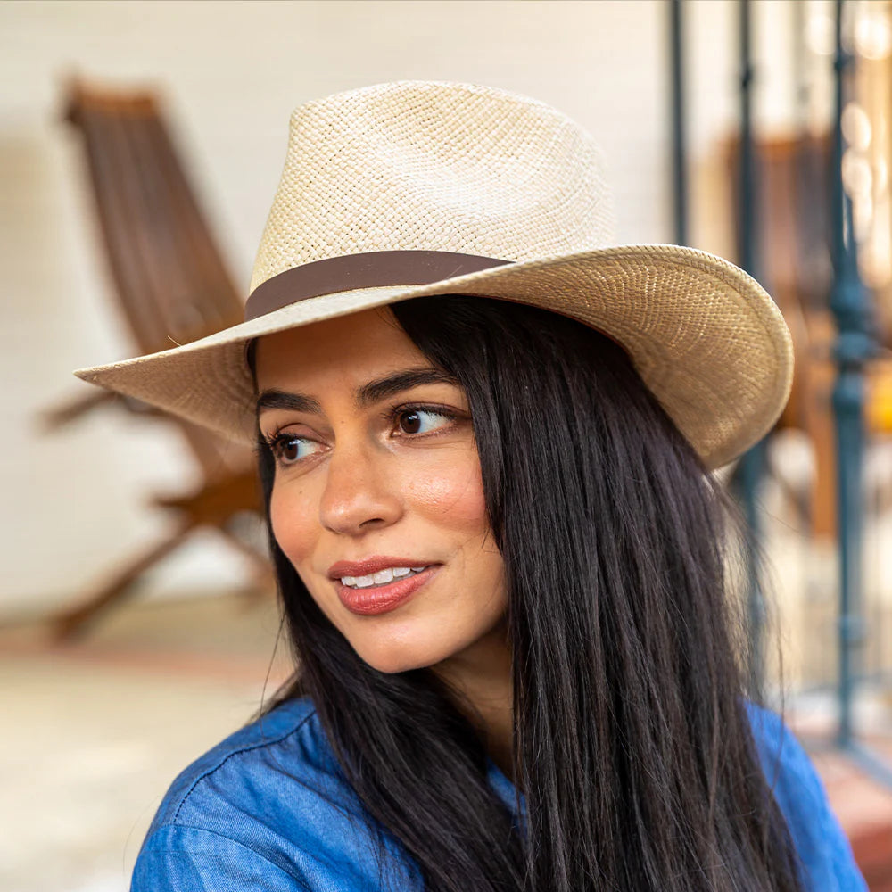 Featuring a classic style with a rustic charm, this wide-brim outback hat offers versatility for various events. Crafted from hand-woven straw and adorned with a leather band, it's a great addition to any outfit.