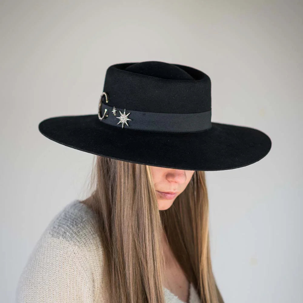 Wide brim felts are a must this season, and this celestial beauty puts a unique spin on the iconic look. Introducing the Aphrodite by Scala. Equipped with a 4" brim and decorated with charms, this angelic hat is one-of-a-kind.